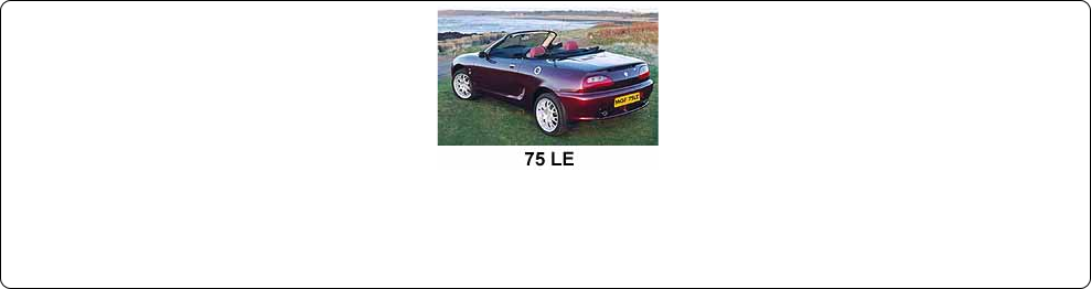 The 75 LE (March, 1999) was launched as a celebration model to commemorate the 75th anniversary of the MG car company (1924-1999). The specification of this model mirrored in many ways the earlier Abingdon LE with unique colours (Mulberry red and solid black) with leather and the fabric hood in a contrasting colour (black on red cars, red on black cars). Chrome interior and exterior highlights were as per Abingdon LE. Interestingly silver was a colour option offered in some markets (but not the UK). The 75 LE came with Multispoke design 16" wheels, and with either 1.8i or VVC engine options.
