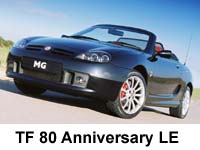 80th Anniversary LE (January, 2004), was launched in celebration of the MG marque's 80th anniversary. There were three exterior colour options: Pearl Black, Starlight Silver and Goodwood Green. All engine and transmission options were available. Interestingly, the silver and black anniversary models were trimmed differently from the green cars, with burgundy red hood, ash grey interior with grenadine Alcantara and black leather seats and bright-finish console, door casings, gear knob and handbrake grip. In contrast, the Goodwood Green Anniversary TF is more traditional in style, combining tan hood with matching tan interior and black Alcantara and tan leather seats. Wood effect inserts are fitted to the console, doors, gear knob and leather steering wheel. All models feature a folding windstop and CD tuner. 16" 11-spoke alloy ‘shadow chrome finish’ wheels are fitted, along with front fog lamps and bright door handles. Anniversary ‘1924 MG 2004’ logos are found on the boot lid and embroidered on the seats, which distinguishes the 80th Anniversary LE from other LE models.